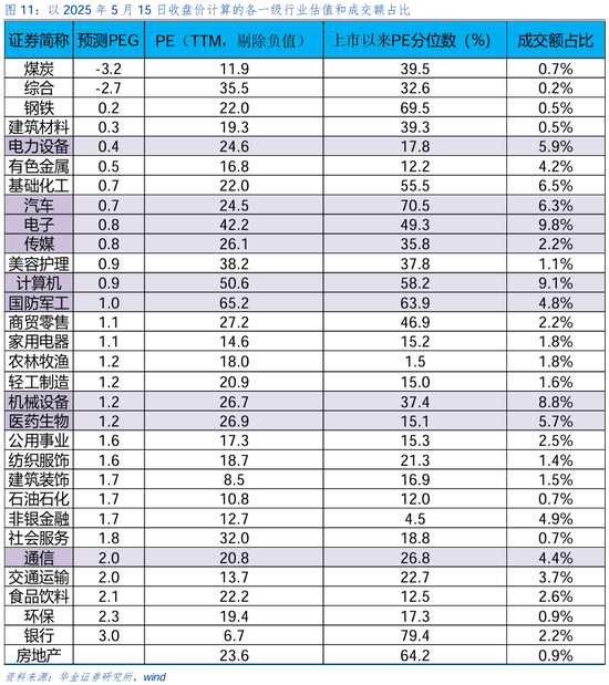 从估值性价比角度建议关注成长中的电力设备、汽车、电子、传媒、计算等行业。从估值性价比角度筛选成长和消费相关的行业:首先,科技成长方面,电力设备、汽车、电子、传媒、计算机以2025年预测盈利为基础计算的的PEG小于1,传媒、通信、医药、军工等行业成交额占比在成长类行业中较低;其次,消费方面,美容护理、商贸零售、家用电器等行业以2025年预测盈利为基础计算的的PEG较低,在1附近,农林牧渔、食品饮料、轻工、家电、社服等行业PE分位数较低,处于20%以下;最后,综合来看,建议关注成长中的电力设备、汽车、电子、传媒、计算机和消费中的食品饮料、美容护理、家电、商贸零售等行业。